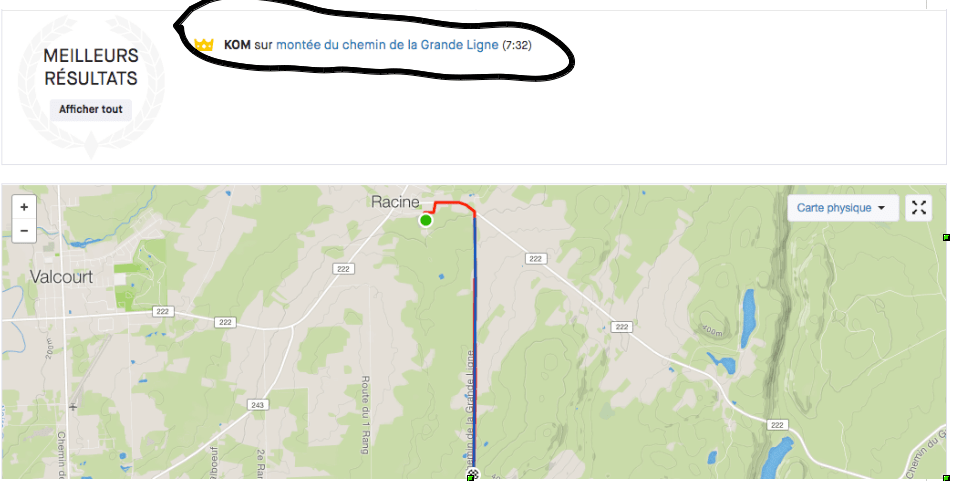 Voilà, c’est La montée de la Grande Ligne, un segment Strava dont j’ai encore le KOM (King Of the Montain), avec un temps de 7:32 réalisé le 3 août 2014.