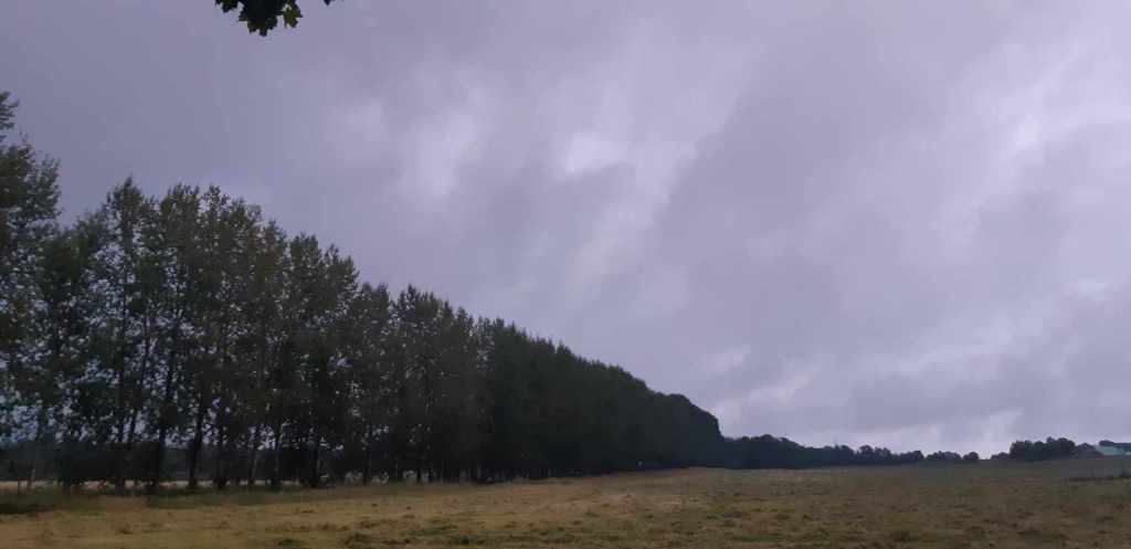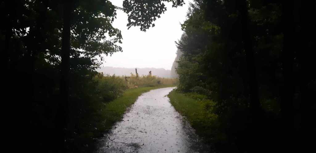 Le soir était plein des averses du jour. De toutes ces averses quotidiennes d’août. Je me suis arrêté dans la courbe de la piste cyclable avec mon père enroulé dans le paysage. Un dernier gros nuage sombre s’est amené, et la pluie, comme un message, s’est abattue.